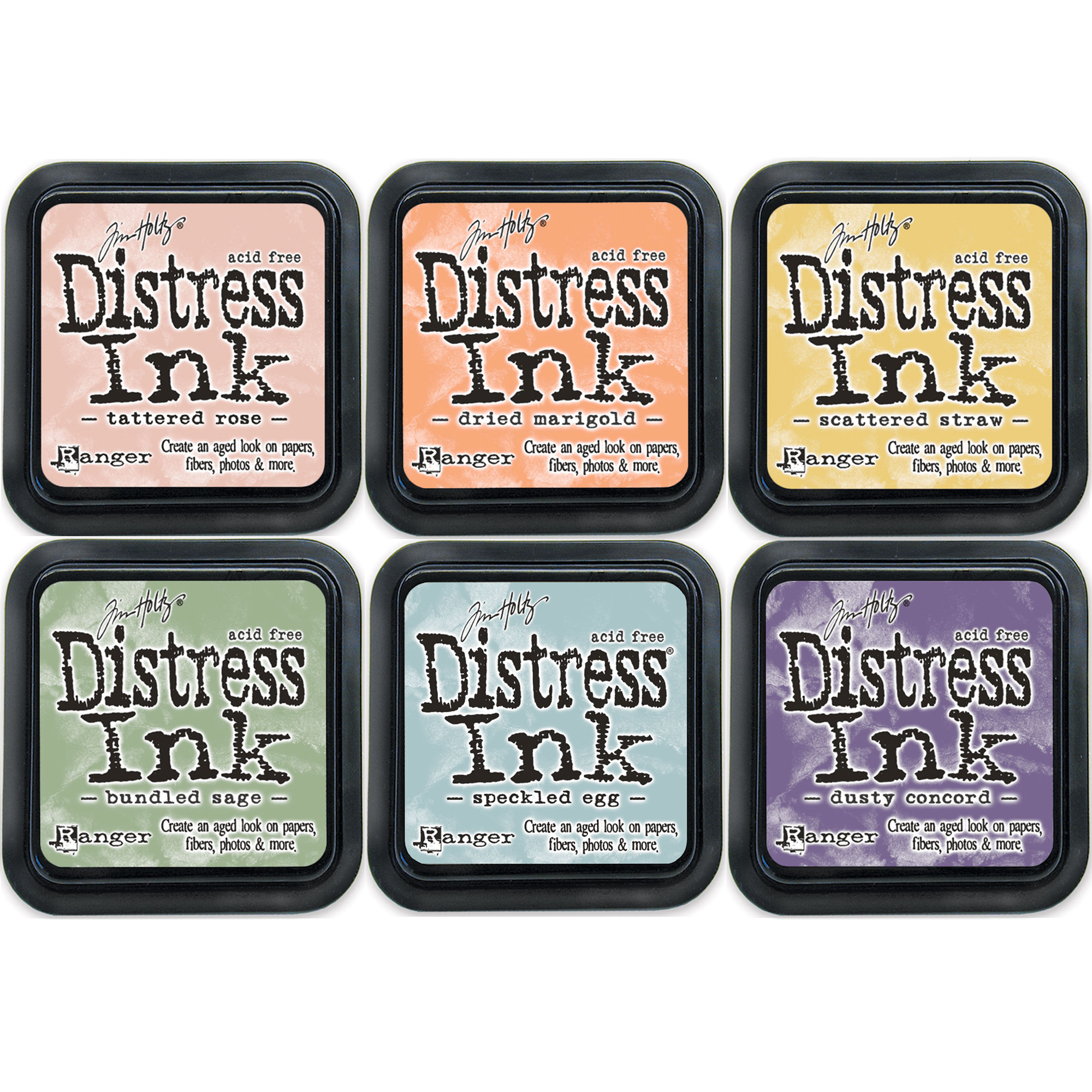Tim Holtz Distress Inks are a collection of acid-free, non-toxic, fade resistant, water-based dye inks. They are perfect for the vintage, stained, aged effect that crafters are creating in their altered books, scrapbook pages, cards and paper craft projects. Tim selected the colors and helped develop these inks to produce a realistic, weathered look on paper, photos and decorative fibers. All the colorful Distress Inks afford added versatility when photo tinting and color layering with the original, award winning tones. The 3 x 3 inch pads are made with a raised felt for easier use with direct to paper techniques and inking up larger stamps.