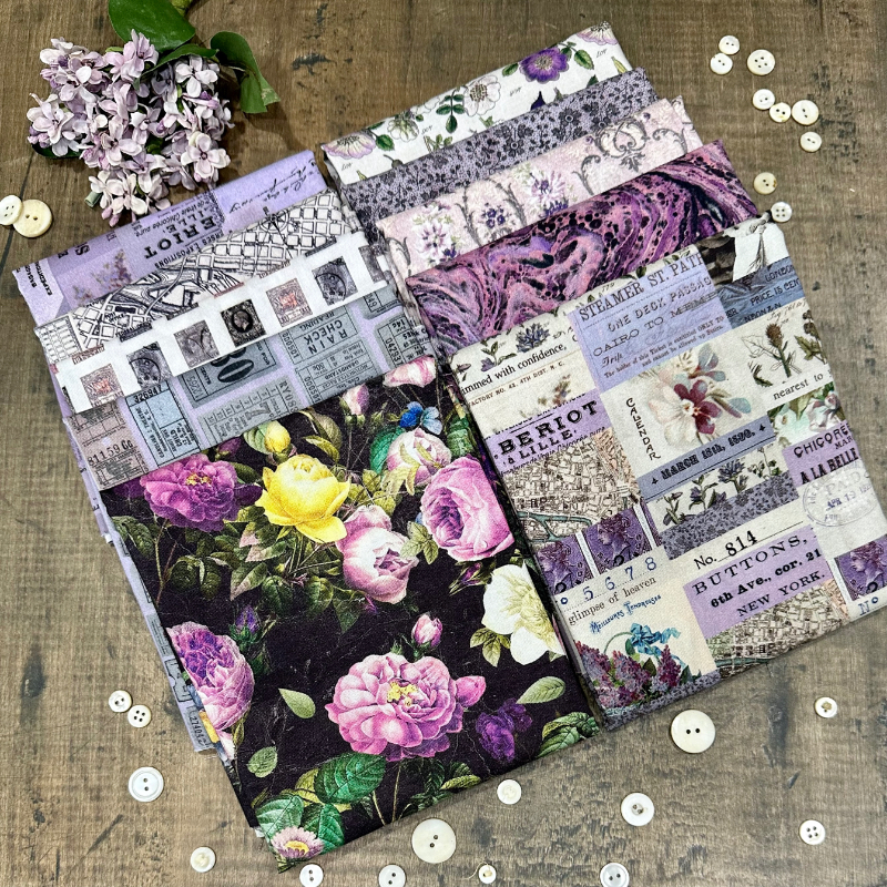This bundle of fat quarters is a delightful collection of artistic vintage patterns in purple tones designed to inspire your creativity. This bundle includes 10 cotton fat quarters featuring unique designs.