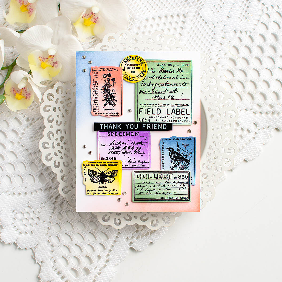 The Tim Holtz stamps are neatly trimmed, deeply etched, and made with high quality rubber in the USA. The full set measures approximately 7 x 8.5 inches.