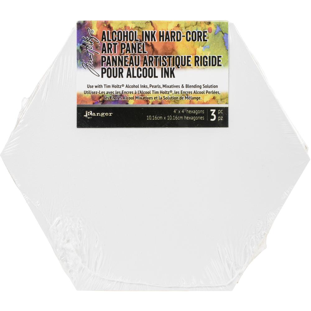 Tim Holtz Alcohol Ink Hard-Core Art Panel is a versatile substrate for fine art and mixed media techniques using Tim Holtz Alcohol Inks, Pearls, Alloys Mixatives, and Blending Solution. Hard-Core Art Panels are double-sided vinyl with an Engineered-Wood-Rigid-Core MDF board offering an ideal surface that remains rigid and flat. Vinyl is mounted with a pH non-yellowing permanent adhesive which creates a ready to use bright white, lightly textured surface. Available in 3-pack of 4 inch hexagons.