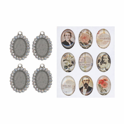 Sparkling frames that can be customized and used to adorn. 4 charms with antique nickel finish and 9 epoxy stickers. Each frame measures approximately 1.5 inches tall.