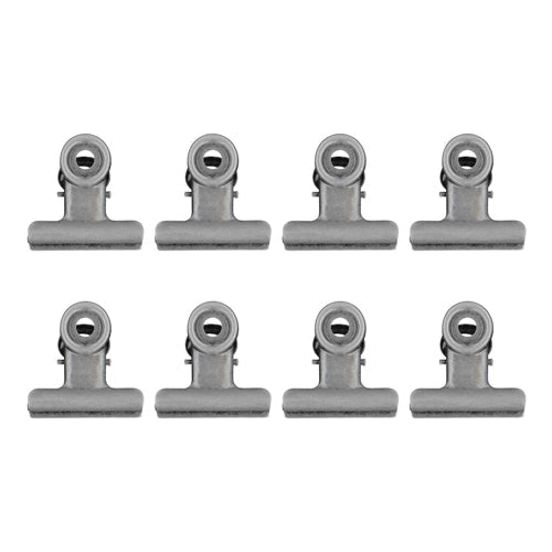 A clasp used to hold items in position. Includes 8 clips with antique nickel finish. Approximate measurements are 1.1875 inches and 1.125 inches.