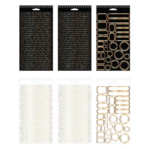 Add some shine to your work. This set of stickers feature an assortment of 354 adhesive backed inspirational words, short phrases, and frames with a gold and rose gold metallic finish. Packaged in a convenient spiral-bound book to easily find the perfect thing to say. 1 set of stickers printed on a white background, 1 set on a black background to bring good vibes to any project. Includes 354 stickers. Sheets are approximately 8.75 x 4.5 inches. Words and phrases are approximately 0.25 inches in height and frames are approximately 0.5 to 1.25 inches in height.