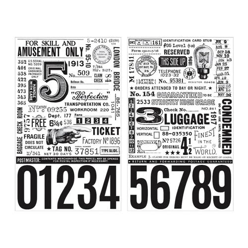 Tim Holtz Remnant Rubs Eccentric is a large array of imagery that are easy to rub-on your next craft make. The Remnant Rubs include two different sheets of numbers, words, and other elements for journaling, cards, and more.