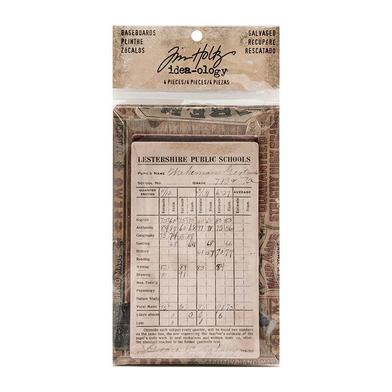 Tim Holtz idea-ology Salvaged Baseboards are thick, printed bookboards perfect for creating sturdy foundations and vintage-inspired layers in your mixed media, collage, or journal projects. With 4 pieces in a pack, each piece features authentic, aged artwork reminiscent of antique books, labels, and documents.