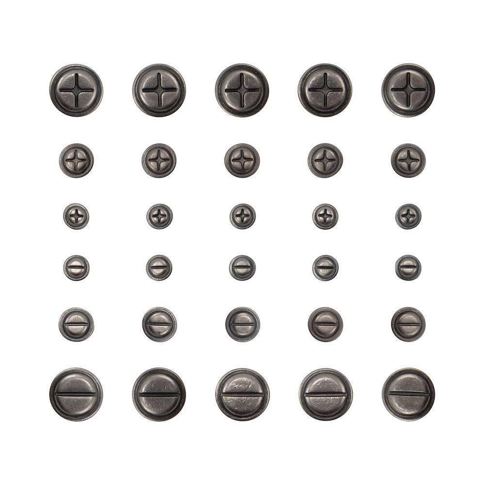 Elevate your style with Tim Holtz Idea-ology Screw Heads. These meticulously crafted, flat-backed screws are perfect embellishments for junk journals, mixed media projects, Vignette Boxes, and more. Available in three sizes—.03cm, .5cm, and 1cm in diameter—these small metal adornments mimic hardware and add an industrial touch to your creations. Each pack includes 30 pieces, constructed of metal.
