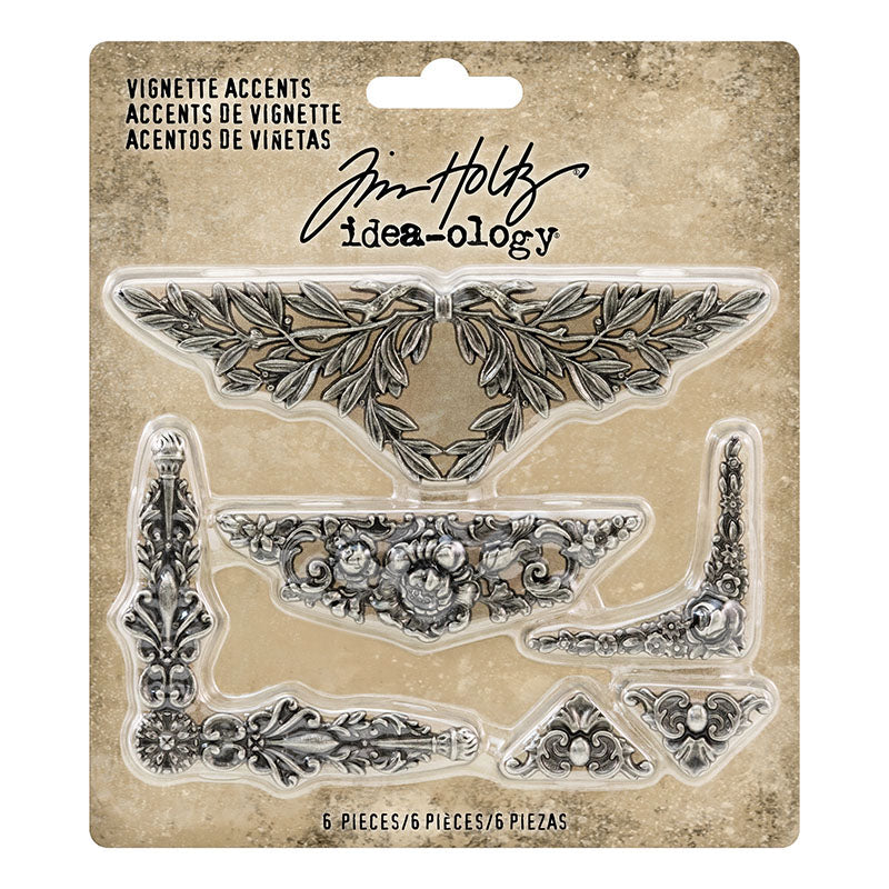 Ornate, thin metal accents to adorn vignette boxes, trays or panels. Includes 6 pieces. For reference, the largest vignette accent is approximately 4.1875 inches across.