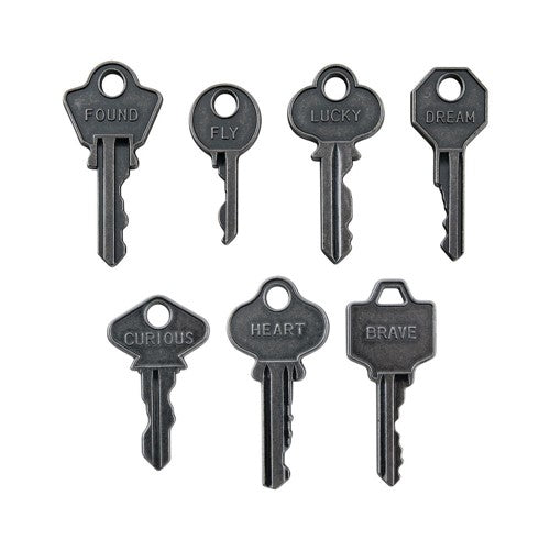 Tim Holtz Word Keys are dimensional metal keys adornments with raised words for making a statement on your next make. Alter them, adhere them to cards or hang them from journals and more.