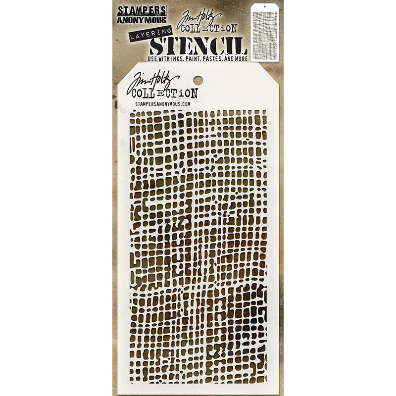 The Tim Holtz Layering Stencil Burlap measures 4.125 x 8.5 inches curated by the renowned Tim Holtz. This tag-shaped stencil is ideal for mixed media projects, this versatile stencil adds rich texture and layered imagery to your work. Whether you're using inks, paints, sprays, or pastes, it delivers stunning results with its image of a detailed burlap sack background pattern. Stencils have a convenient hole at the top for easy storage with the Tim Holtz Cable Binder Ring 3 Pack CBR3, sold separately. Proudly made in the USA by Stamper's Anonymous.
