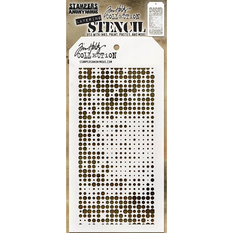 Tim Holtz Layering Stencil Halftone measures 4.125 x 8.5 inches and comes in a tag shape. Whether you're using inks, paints, sprays, or pastes, it delivers stunning results with a textured background. This stencil has a textured background pattern of halftone circles. Stencils have a convenient hole at the top for easy storage with the Tim Holtz Cable Binder Ring 3 Pack CBR3, sold separately. Proudly made in the USA by Stamper's Anonymous.
