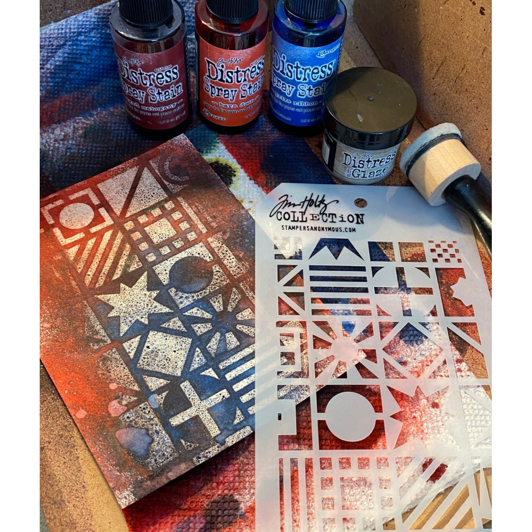 Tim Holtz Layering Stencil Patchwork Cube measures 4.125 x 8.5 inches and comes in a tag shape. Whether you're using inks, paints, sprays, or pastes, it delivers stunning results with a textured background. This stencil has a textured background pattern of cubes with designs. Stencils have a convenient hole at the top for easy storage with the Tim Holtz Cable Binder Ring 3 Pack CBR3, sold separately. Proudly made in the USA by Stamper's Anonymous.