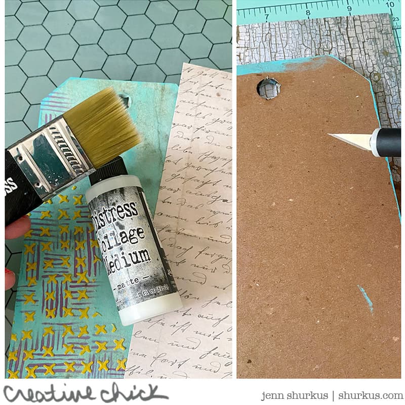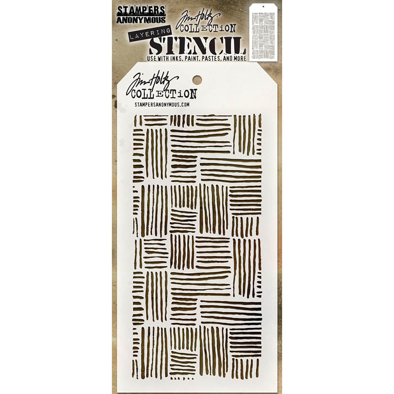 Tim Holtz Layering Stencil Thatched measures 4.125 x 8.5 inches and comes in a tag shape. Whether you're using inks, paints, sprays, or pastes, it delivers stunning results with a textured background. This stencil has a textured background pattern of lines. Stencils have a convenient hole at the top for easy storage with the Tim Holtz Cable Binder Ring 3 Pack CBR3, sold separately. Proudly made in the USA by Stamper's Anonymous.
