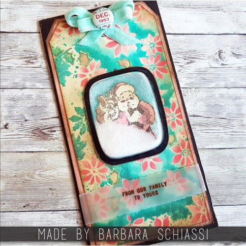 Tim Holtz Layering Stencil Tiny Poinsettia measures 4.125 x 8.5 inches and comes in a tag shape. Whether you're using inks, paints, sprays, or pastes, it delivers stunning results with a textured background. This stencil has a textured background pattern of flowers. Stencils have a convenient hole at the top for easy storage with the Tim Holtz Cable Binder Ring 3 Pack CBR3, sold separately. Proudly made in the USA by Stamper's Anonymous.