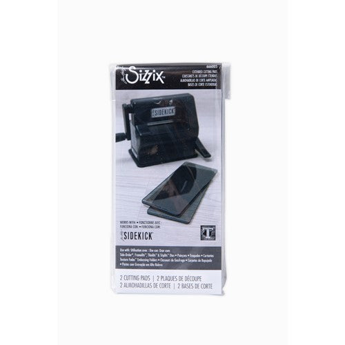 This pair of Black Extended Cutting Pads was specially designed for use in the Sidekick machine. Curated by Tim Holtz in a signature black color, these cutting pads offer versatility when cutting and they allow you to cut longer dies when using your Sizzix Sidekick. Constructed of high-quality polycarbonate plastic, utting Pads allow for easy die-cutting Sizzix chemically etched wafer-thin dies (Thinlits, Framelits and Triplits) in the Sidekick machine. Simply sandwich the die and material to be cut between the Cutting Pads and roll through the machine. Each Cutting Pad measures 6 x 2.625 x 0.125 inches.
