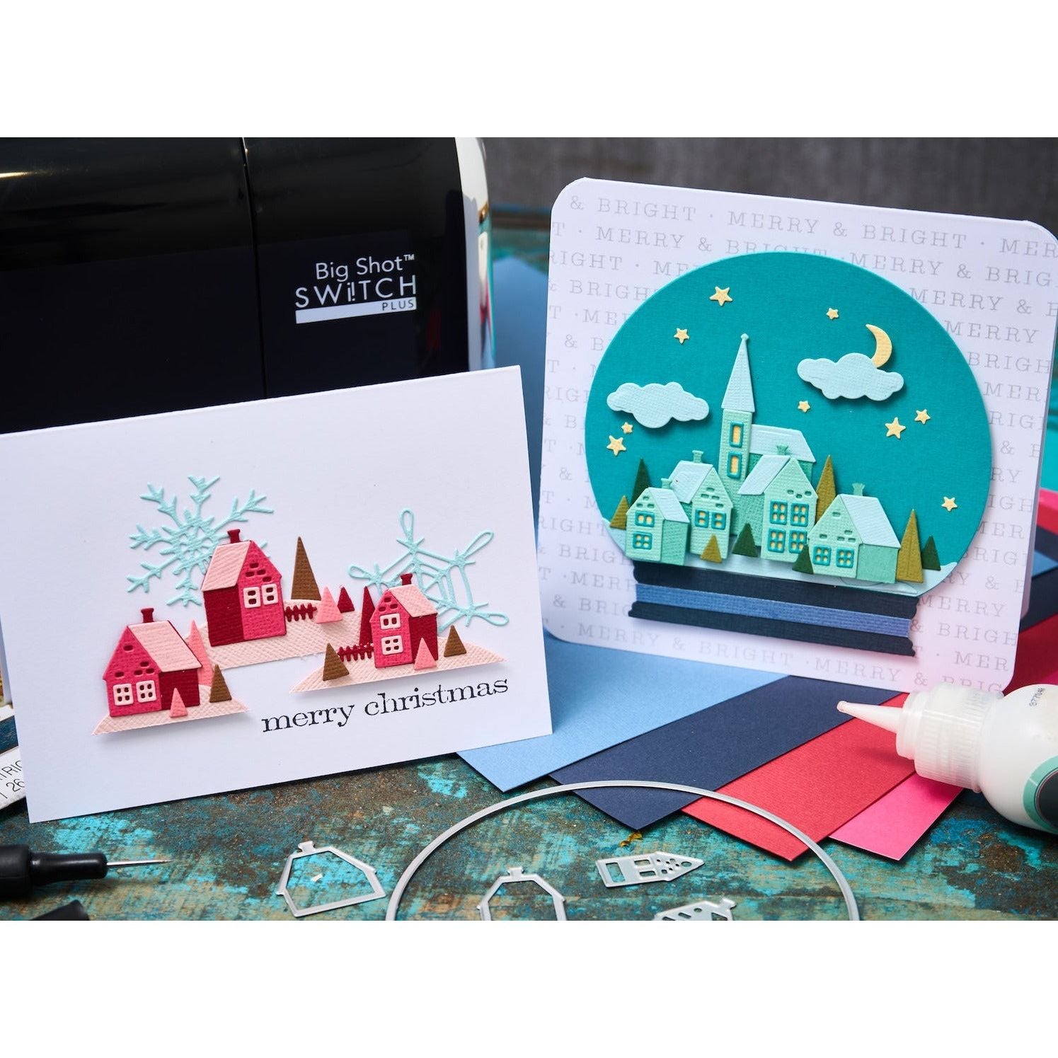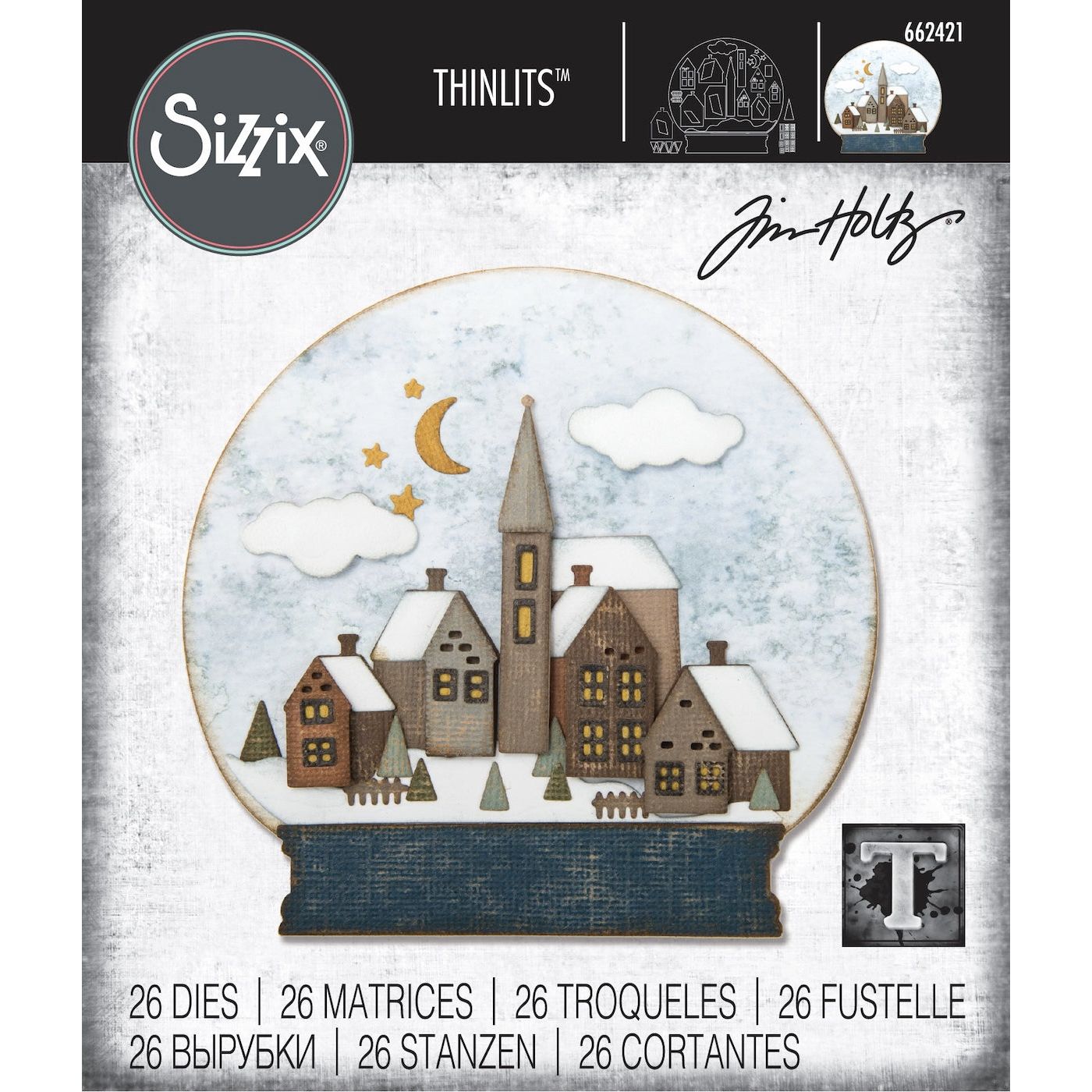 Tim Holtz Sizzix Snowglobe 2 Thinlits Dies are a festive addition to your holiday crafting. This set includes 26 dies for creating enchanting snow globes filled with intricate seasonal details, perfect for adding a magical touch to holiday cards, ornaments, and decorations. Designs include a globe and base, crescent moon, stars, clouds, trees, picket fences, snowy landscapes, and buildings to assemble a charming winter village. Approximate die sizes range from 4.5 x 3.75 inches to 0.125 x 0.125 inches.
