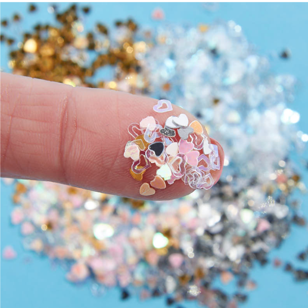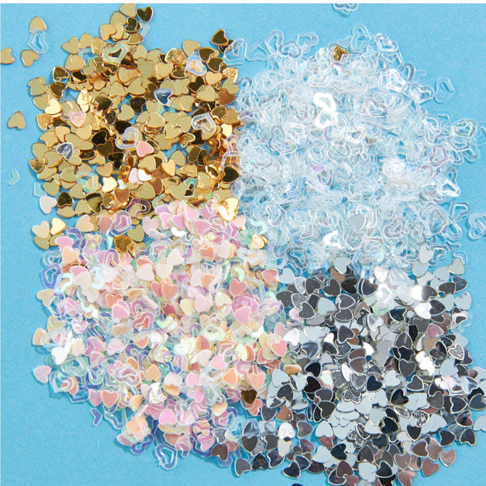 Add a touch of glimmering whimsy to your projects with Tiny Assorted Heart Spangles! These iridescent, gold, and silver spangles can be sprinkled into cards, used as table decorations, or even for dollhouse miniatures. Each pack contains 0.4 oz of sparkling fun.