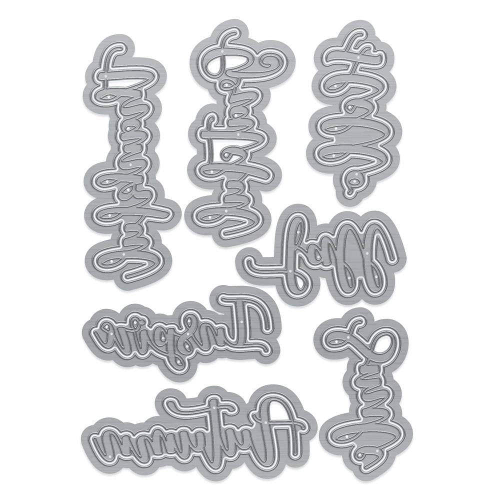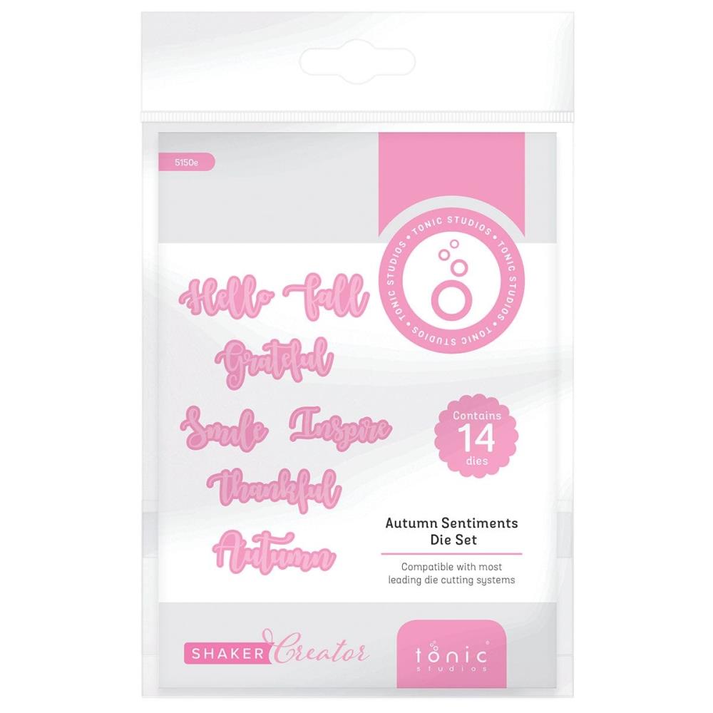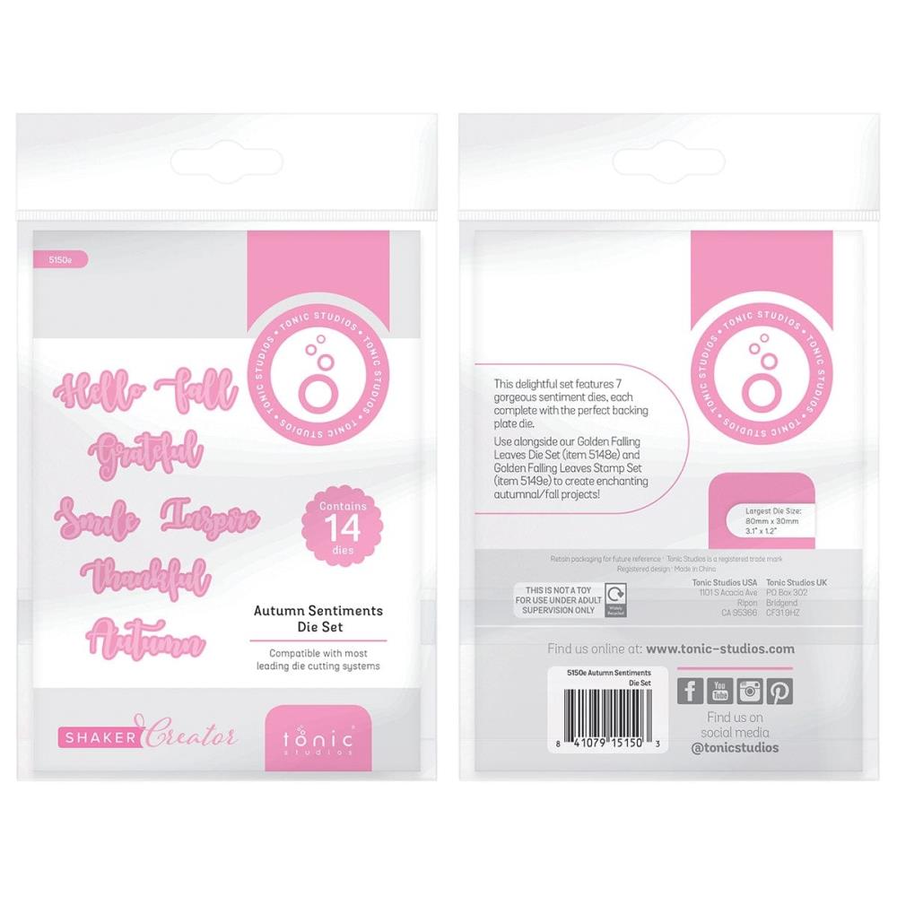 Enhance your shaker cards with ease using the Tonic Autumn Sentiments Dies 5150e. This comprehensive set includes 7 stunning sentiment dies, each accompanied by a complementary backing plate die. Pair it with the Golden Falling Leaves Die Set (item 5148E, sold separately) and Golden Falling Leaves Stamp Set (item 5149E, sold separately) for charming autumnal projects. With 14 dies, including a 80mm x 30mm (3.1 x 1.2 inches) die, you'll have everything you need to create captivating shaker cards.