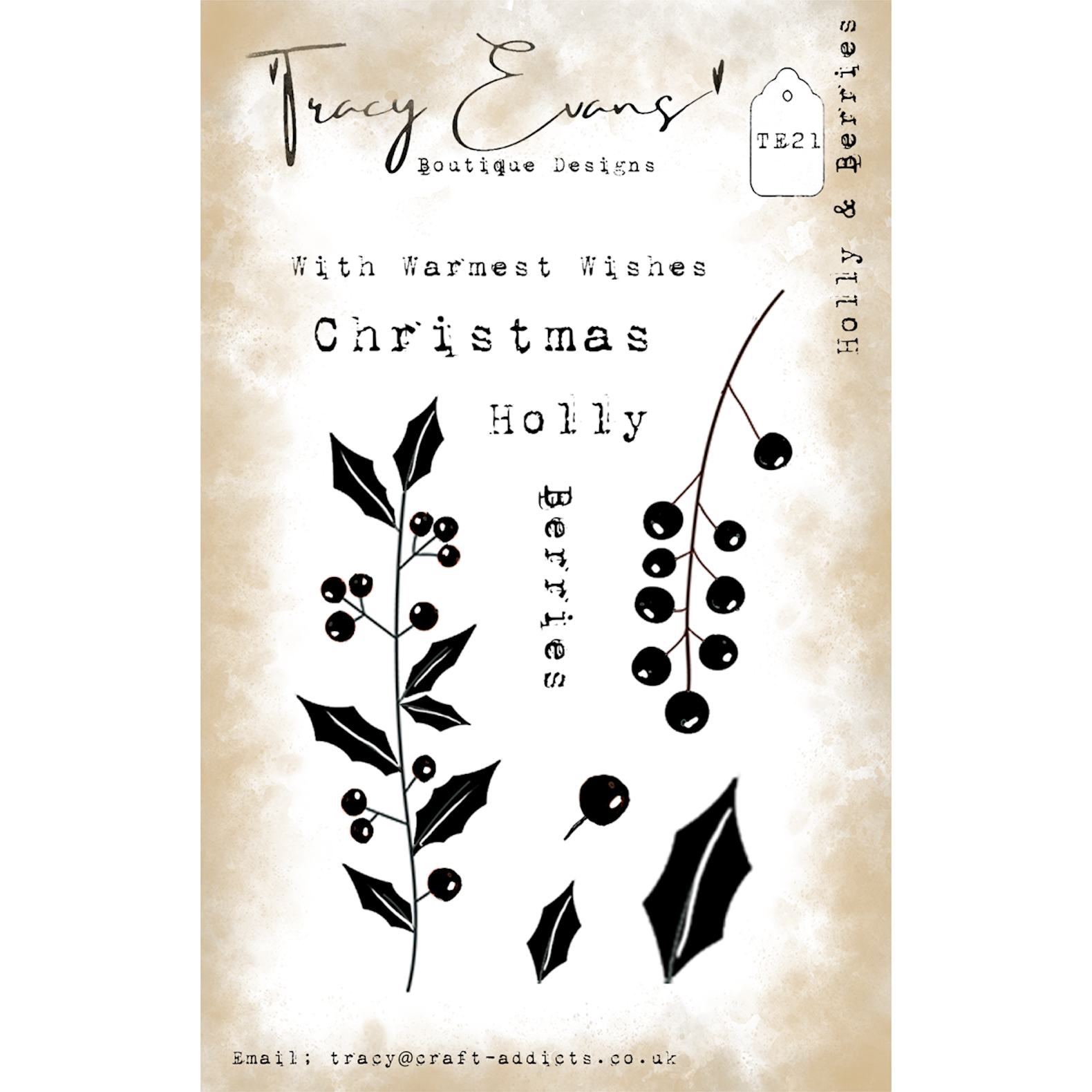 The Tracy Evans Boutique Designs Holly and Berries A7 Clear Stamps bring a touch of festive charm to your crafting collection. This 3 x 5-inch set, made from high-quality photopolymer, ensures detailed and crisp impressions. It features 9 pieces, including a twig of leaves and berries, a twig of just berries, additional holly leaves, and a single berry. The set also includes the words "Christmas," "Holly," and "Berries," as well as the sentiment "With Warmest Wishes," perfect for creating warm and joyful holiday cards and decorations.