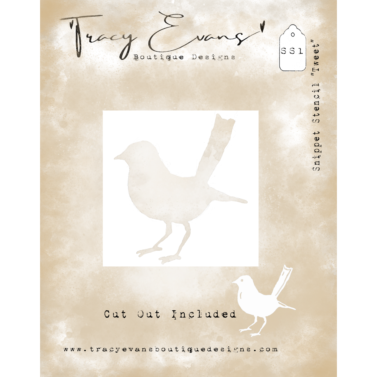 The Tracy Evans Boutique Designs Tweet Snippet Stencil adds a charming avian motif to your crafting projects. This stencil, measuring approximately 4 x 4 inches, features a bird design and includes a cut-out mask for added versatility. Use this stencil in conjunction with the New Beginnings Stamp set te4 for delightful coordinated designs, or utilize it on its own for standalone creations.