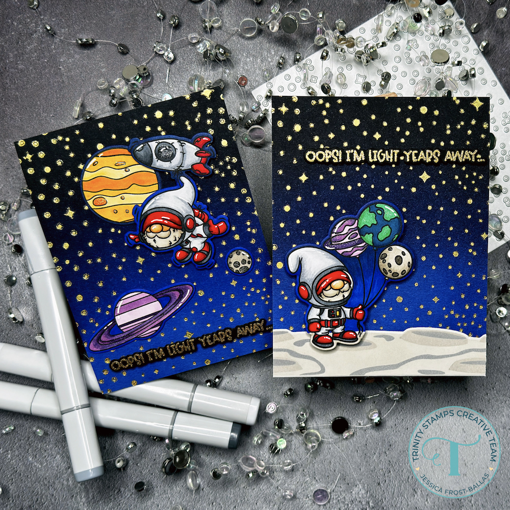 The Trinity Stamps Astronomical Gnomes Coordinating Die Set is designed to perfectly cut out all images and sentiments from the Astronomical Gnomes Clear Stamp Set. This die set includes outlines for the space gnomes, rocket ship, balloons, stars, and birthday-themed phrases—making it easy to add clean, dimensional elements to your galaxy-inspired projects. Compatible with most standard die cutting machines.
