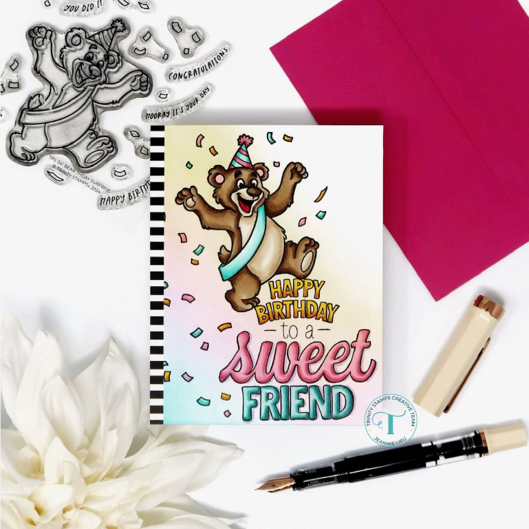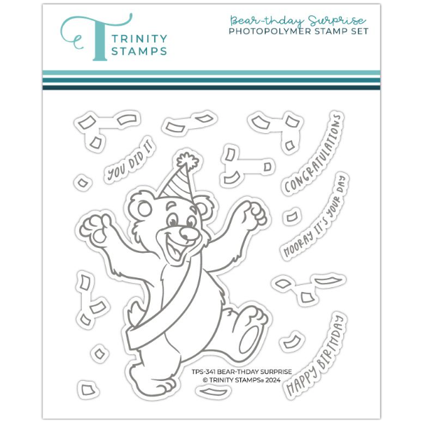 Celebrate in style with the Trinity Stamps Bear-thday Surprise Clear Stamp Set! This versatile 4 x 4 inch set features an adorable 3.25 inch bear and four banner phrases for any occasion. Sentiments include,