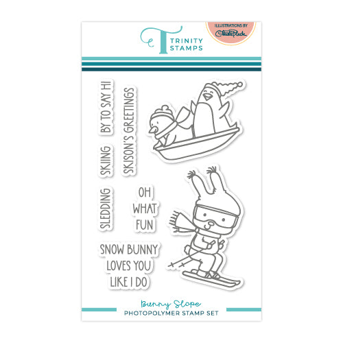 The Bunny Slope 3 x 4 inch Clear Stamp Set features a delightful winter-themed collection with two main images and 6 sentiment stamps. Recreate chilly scenes with the sledding penguin (1.75 x 1.45 inches) and skiing bunny (1.35 x 2.3 inches) images, or pair them with the Ice Friends 4 x 8 inch Clear Stamp Set or the Embossed Edge Hills and Slopes Die Set (sold separately) to craft whimsical wintry stories. Designed by Christie Black for Trinity Stamps.
