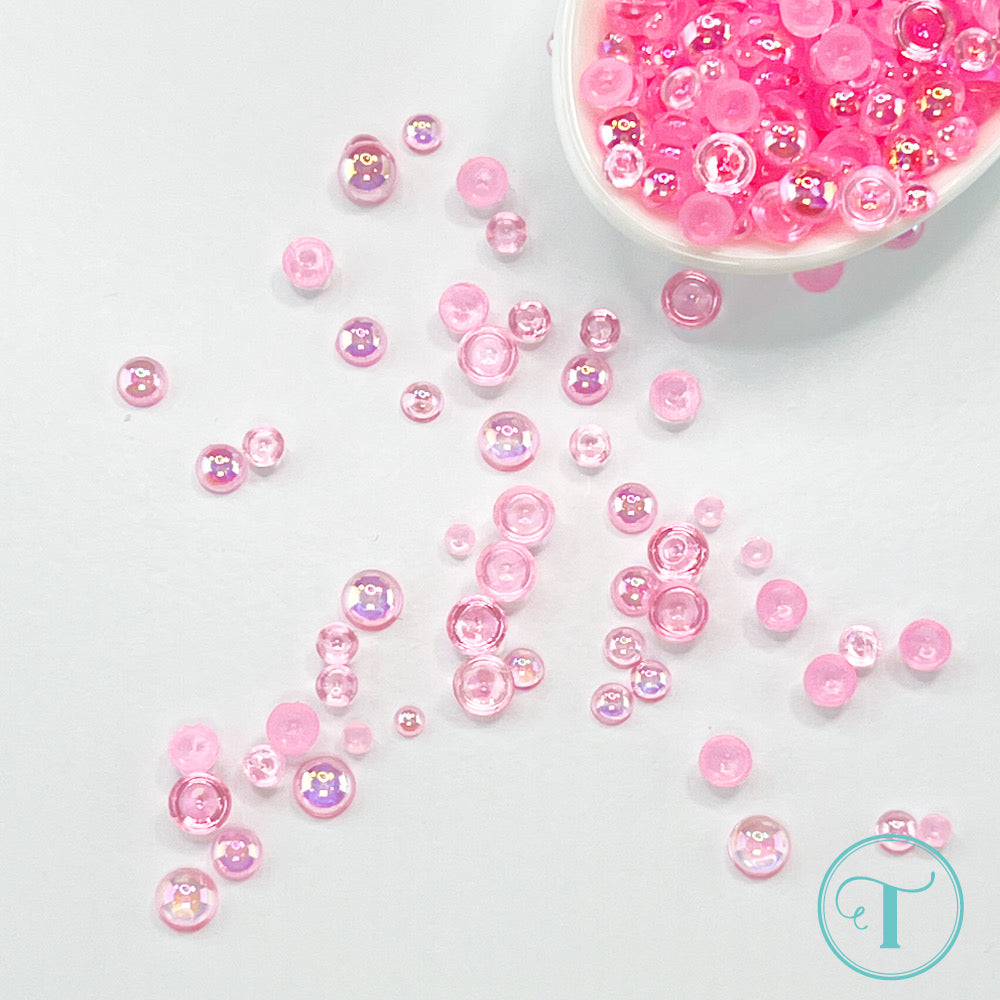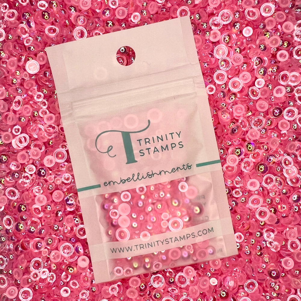 This embellishment mix includes a variety of candy pink flat-back transparent iridescent acrylic pearls in five different sizes, ranging from 3mm to 8mm. It comes in a resealable zip top bag and contains approximately 2 teaspoons of pearls.