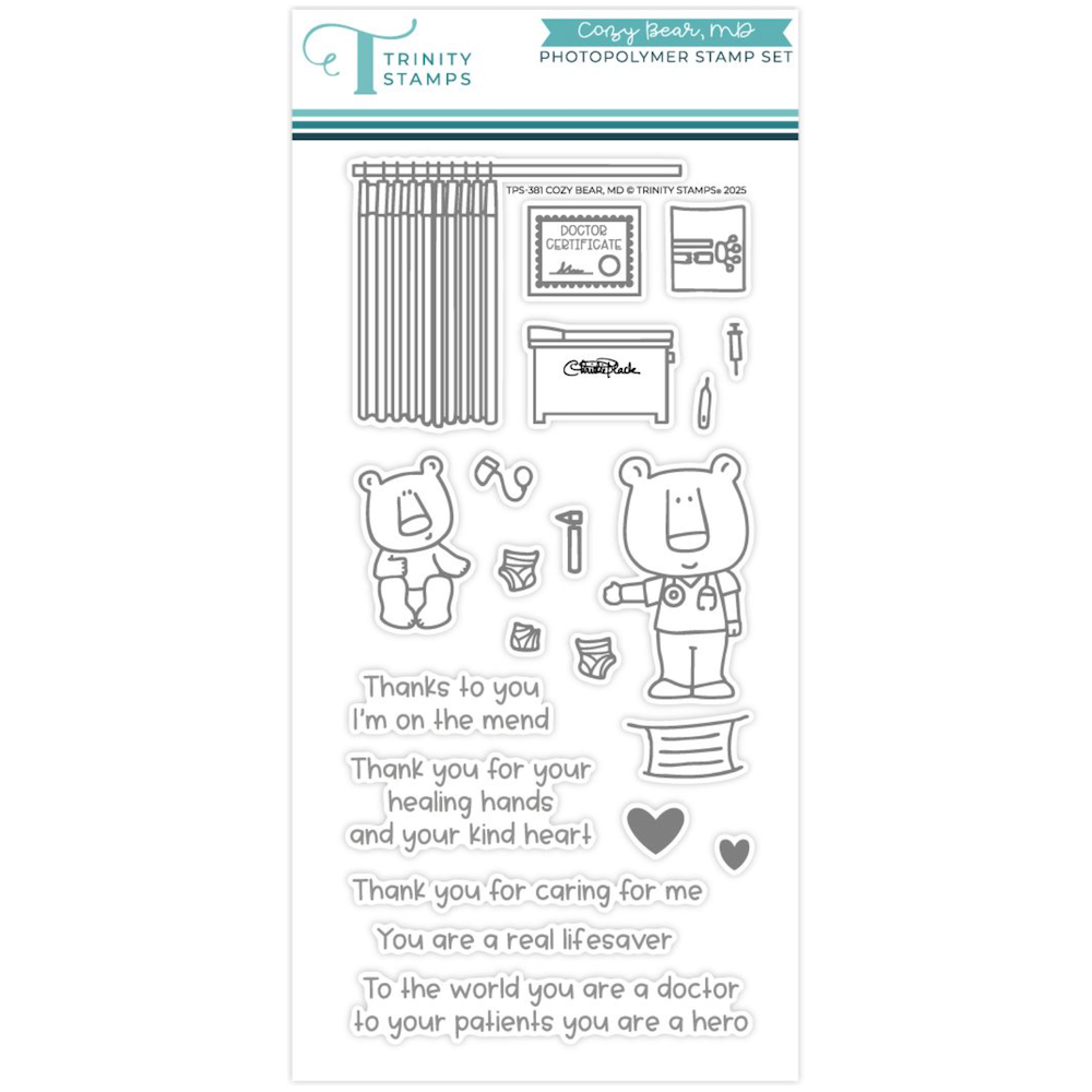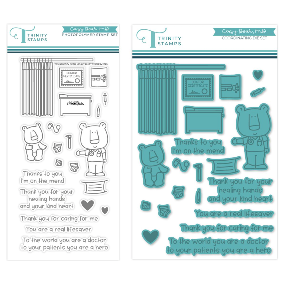 The Trinity Stamps Cozy Bear, MD Stamp and Die Bundle brings heartwarming charm to your get well and encouragement cards. This 4 x 8 inch, 21-piece set by Christie Black features adorable Cozy Bear characters dressed as a doctor and patient, along with five uplifting sentiments. Sentiments include,