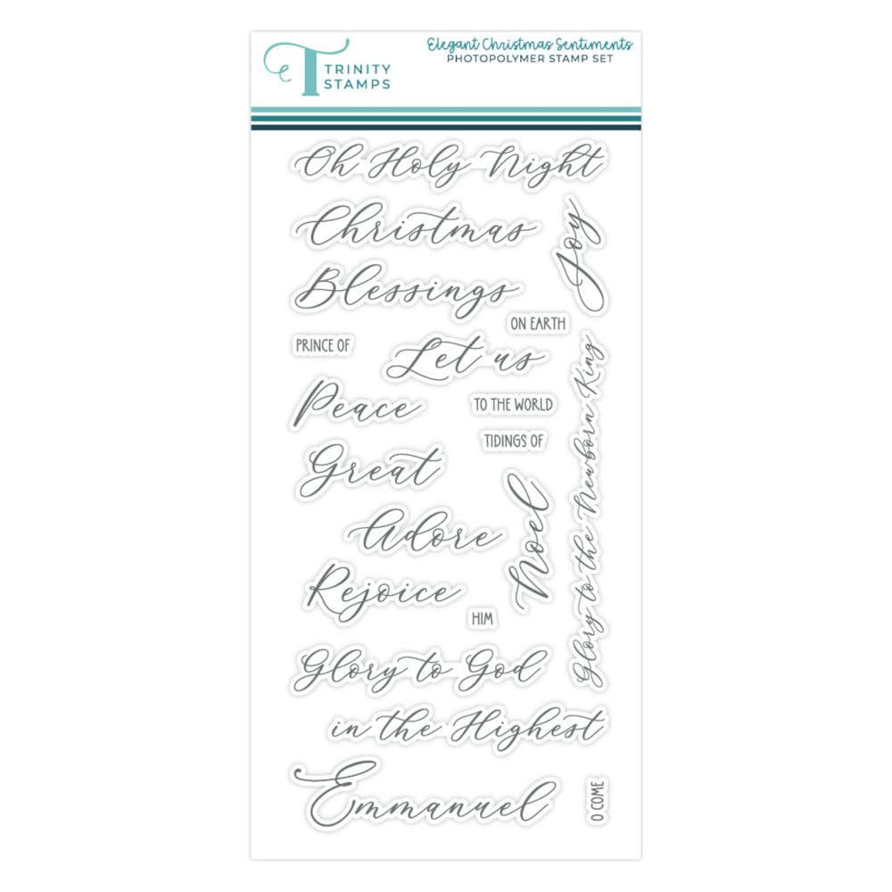 The Trinity Stamps Elegant Christmas Sentiments Clear Stamp Set features 20 beautiful script stamps that can be mixed and matched for endless combinations. This 4 x 8 inch set is perfect for adding an elegant touch to your holiday cards, with the longest sentiment measuring 4 inches. Sentiments include,