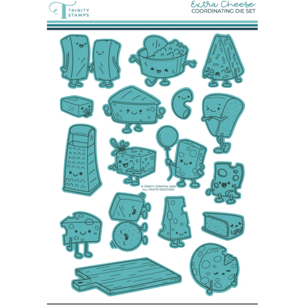 The Trinity Stamps Extra Cheese Die Set includes 17 dies that perfectly cut out every image in the coordinating Extra Cheese 6 x 8 inch Stamp Set. Create fun, layered designs with ease and bring extra cheesiness to your crafting projects!
