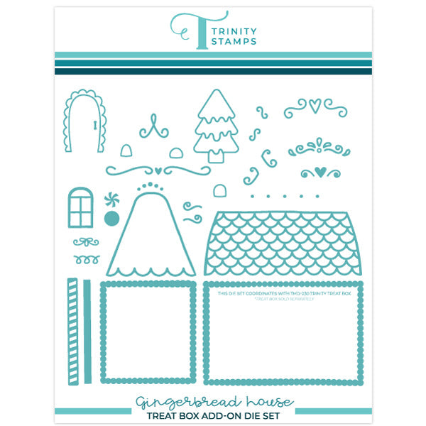 Add festive details to treat boxes, cards or any craft project with the Trinity Stamps Gingerbread House Treat Box Add On Die Set. Perfectly sized to work with the Trinity Treat Box (sold separately), the set contains 20 dies to craft a whimsical gingerbread house look. For best results, use the Rip and Stick tape sheets (sold separately) to hold your cardstock in place before die cutting. Create a delightful craft project with this charming die set.