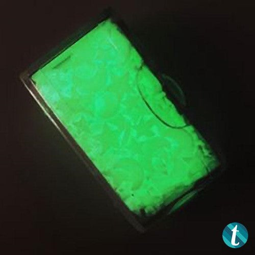 This embellishment mix contains two sizes (5mm and 10mm) clay stars and moons that are white in daylight but glow green in the dark. These sprinkles are packaged in a zip bag.