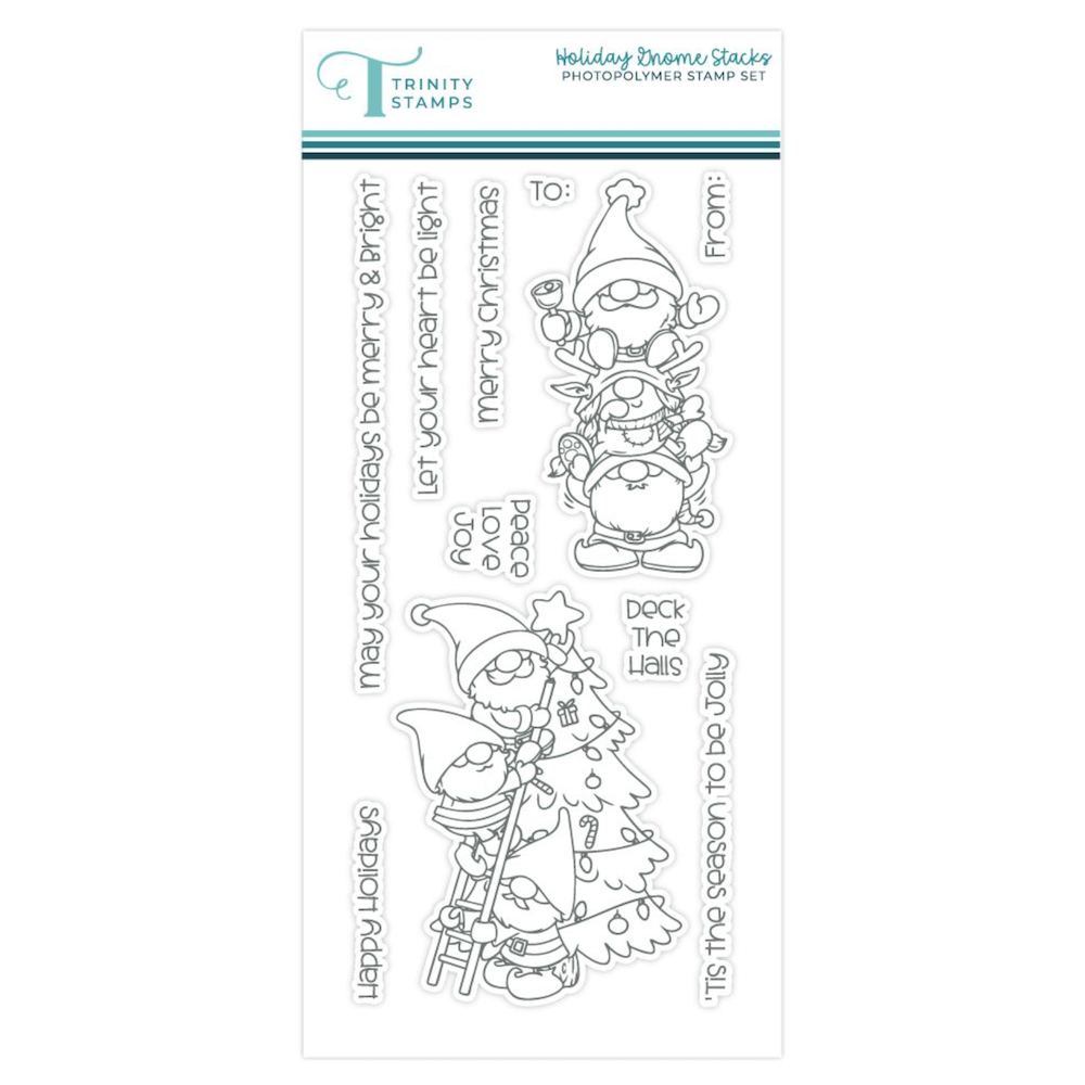 The Trinity Stamps Holiday Gnome Stacks Clear Stamp Set features 11 pieces, including charming stacked gnome images and 9 mix-and-match sentiments, perfect for spreading holiday cheer. Sentiments include,