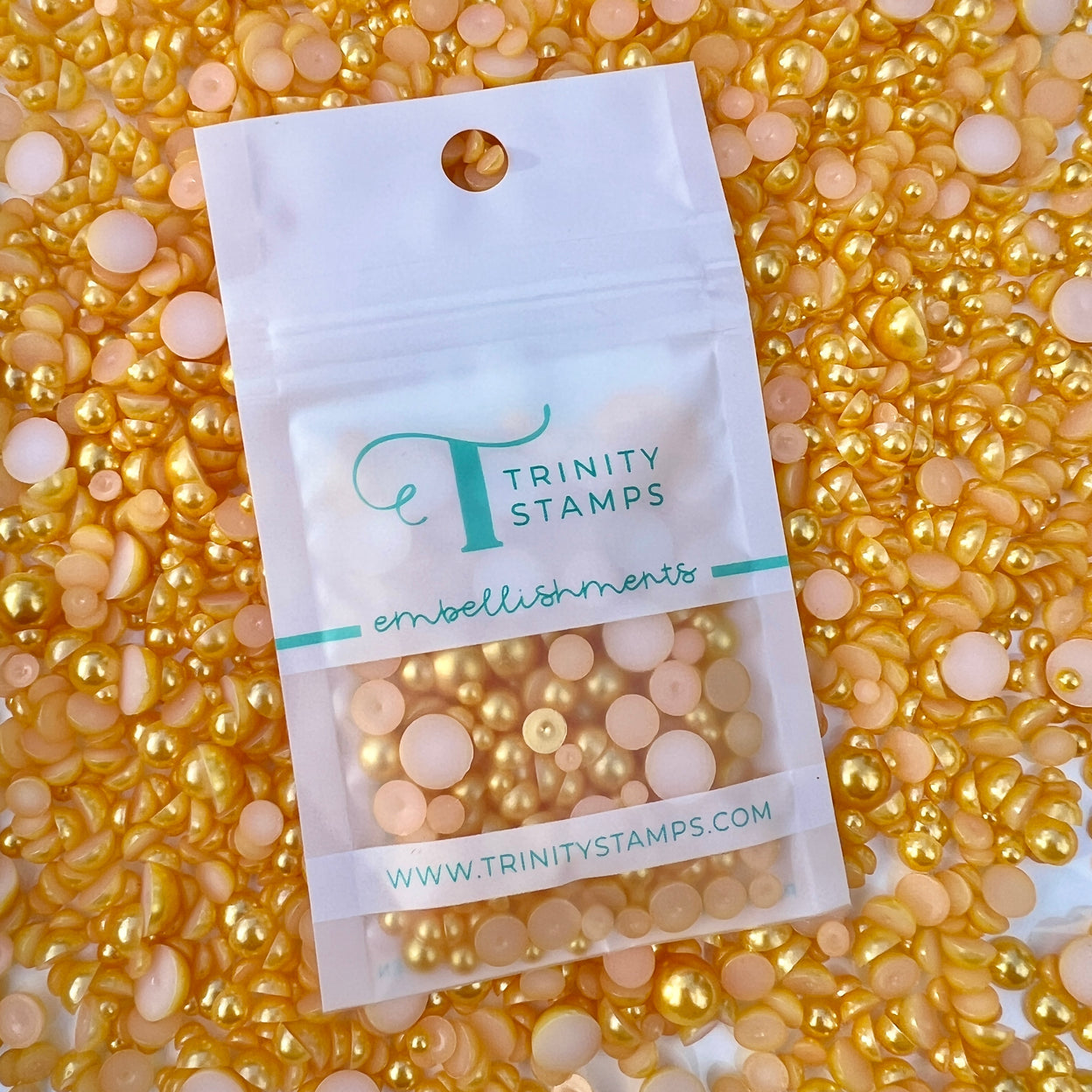 Introduce elegance and sophistication to your crafts with Trinity Stamps Golden Hour Baubles Embellishment Mix. This mix features five sizes of flat-back gold acrylic pearls (3mm, 4mm, 5mm, 6mm, and 8mm) perfect for adding dimension and texture to your projects. With approximately 2 teaspoons in volume and a resealable zip top bag, this mix is a must-have for any crafter.
