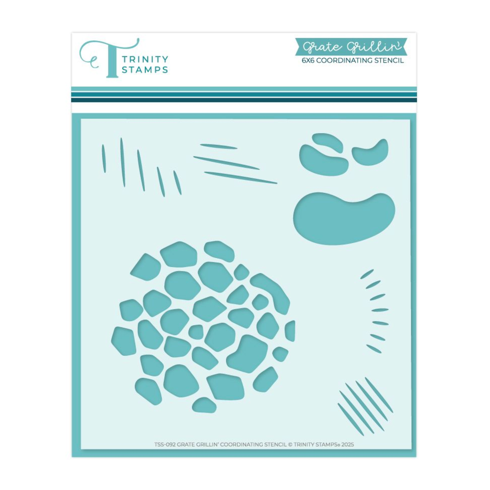 The Trinity Stamps Grate Grillin’ Stencil is a 6 x 6 inch coordinating stencil designed to complement the Grate Grillin’ Die Set. It features a variety of grilling textures, including a stone charcoal pattern, grill marks, meat accents, and heat lines—perfect for adding realistic detail and depth to your BBQ-themed cards and projects. Great for ink blending, pastes, or layered effects, this set brings summer cookout vibes to your crafts.
