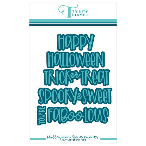 This die set includes twelve dies and an accompanying shadow layer. The longest sentiment, 'Spooky & Sweet' including the shadow layer, is 3.5 x .8 inch. Connection tabs are not included.