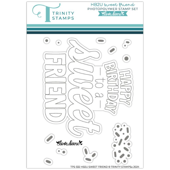 Add a touch of sweetness to your friend's birthday with the Trinity Stamps HB2U Sweet Friend Clear Stamp Set, designed by Love, Dani Studios! This fun set includes 13 pieces, featuring a 'Happy Birthday to a Sweet Friend' sentiment stamp and sprinkle stamps to decorate your cake, cupcake, or donut designs. Perfect for crafting a one-of-a-kind birthday message!