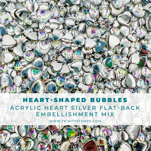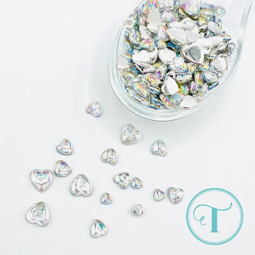 Three different sizes of Flat-backed bubble heart embellishments. These have a silver coating on the back. This mix contains 3 different sizes of hearts 8mm, 6mm, 3mm in a plastic storage container. Approx 130 pieces total.