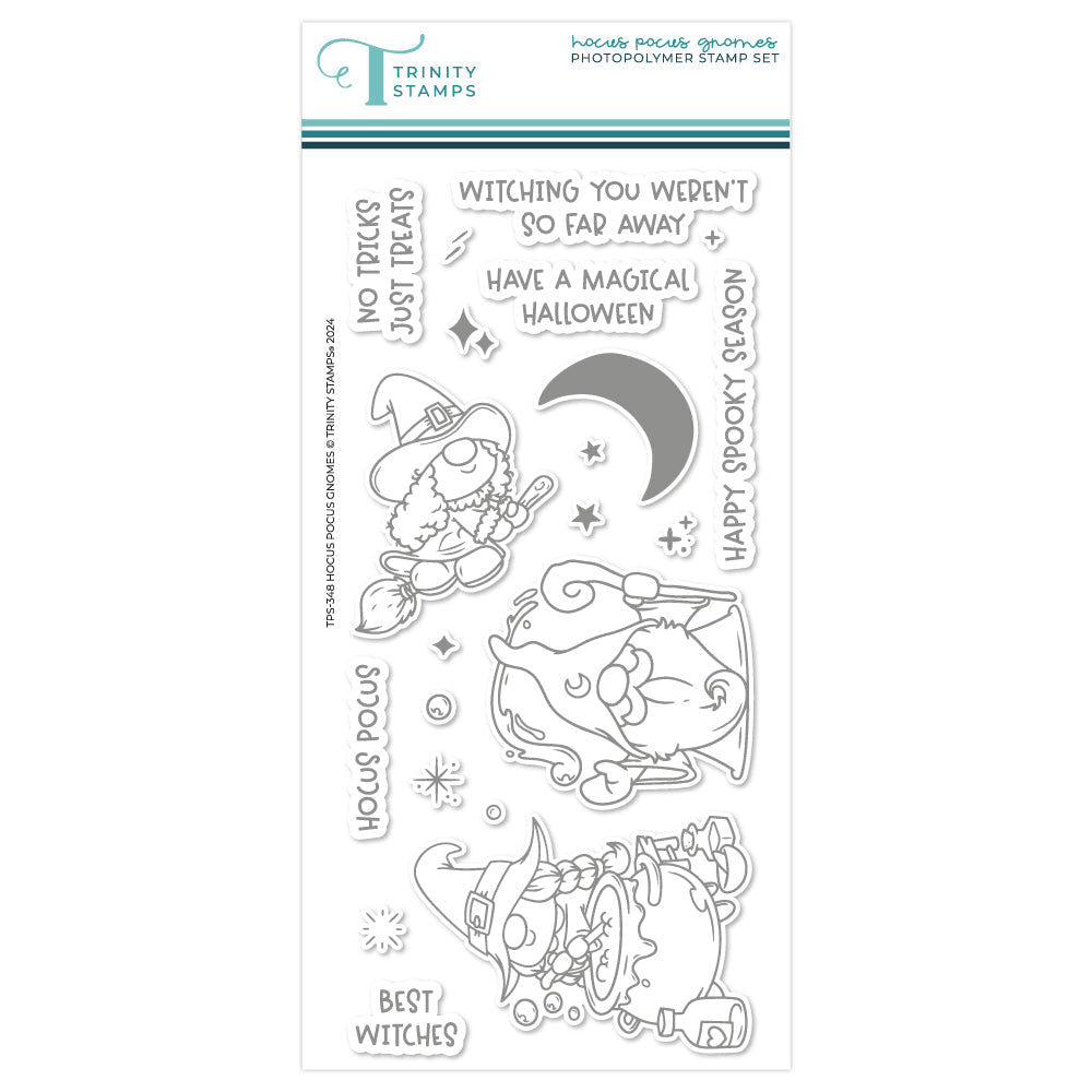 The Hocus Pocus Gnomes 4 x 8 inch stamp set features 22 stamps, including delightful gnomes dressed as witches and wizards, accompanied by whimsical sayings and charming accents. Sentiments include,