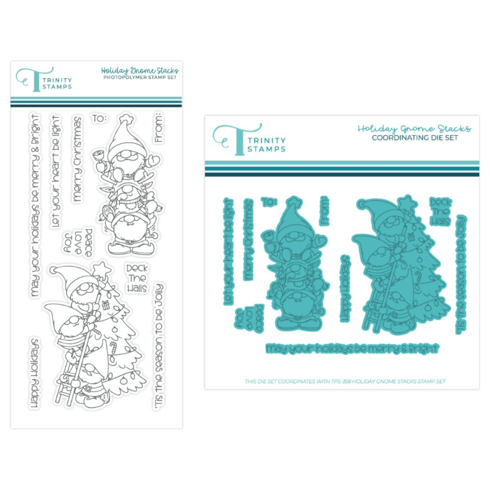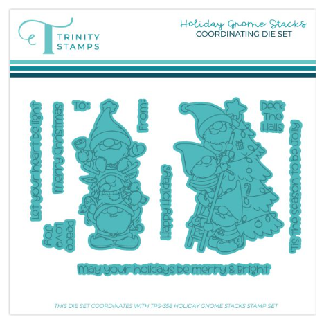 The Trinity Stamps Holiday Gnome Stacks Stamp and Die Bundle includes a charming 4 x 8 inch stamp set featuring stacked gnome images and 9 festive mix-and-match sentiments. Sentiments include,