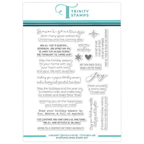 Trinity Stamps Insider Sentiments Christmas Clear Stamps contains 19 timeless stamps in a variety of fonts, perfect for use inside or outside of holiday cards. These stamps also coordinate with a die set (tmd-c279, sold separately).