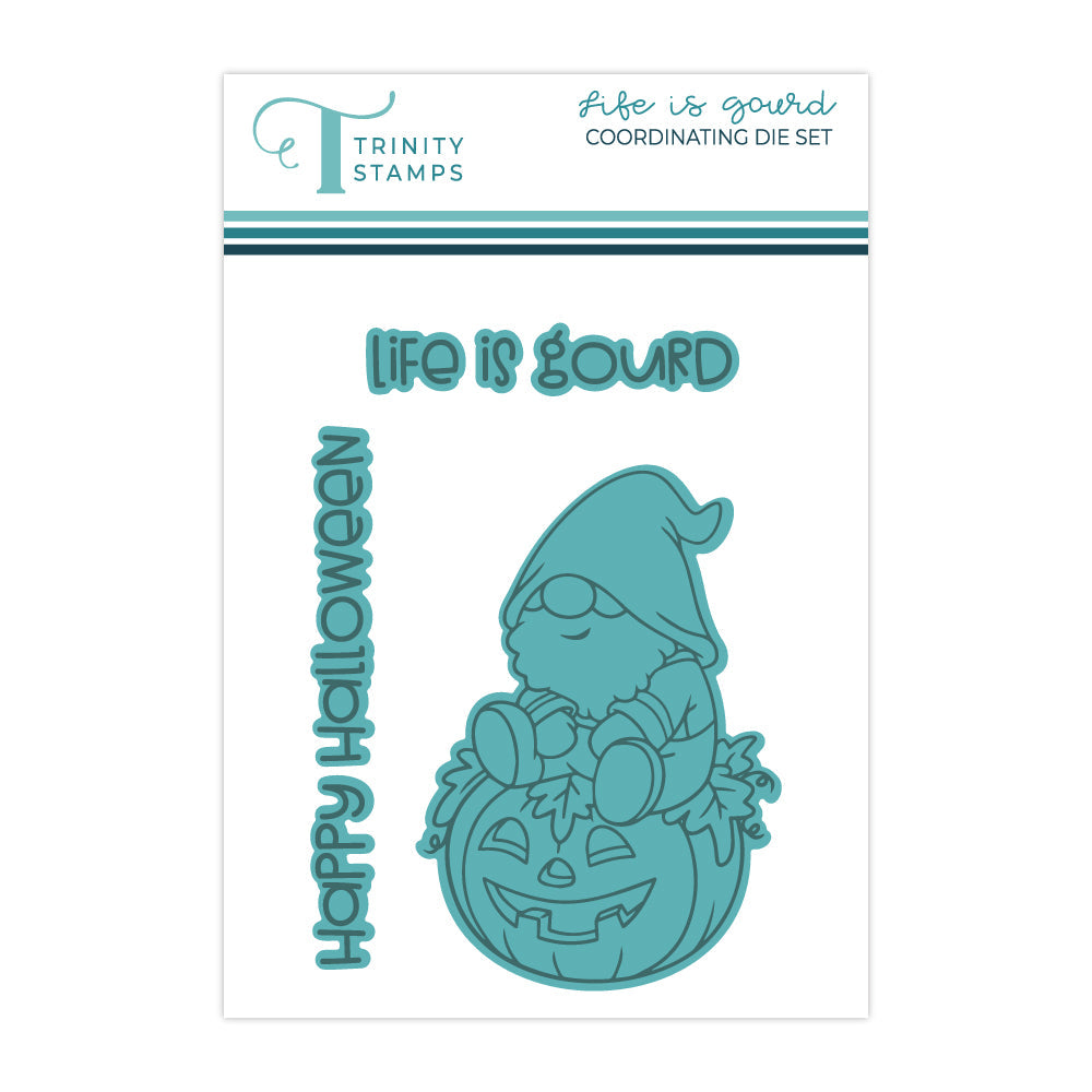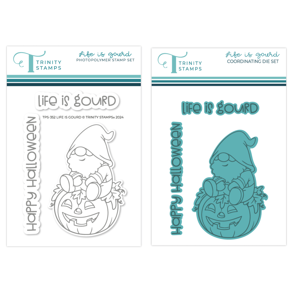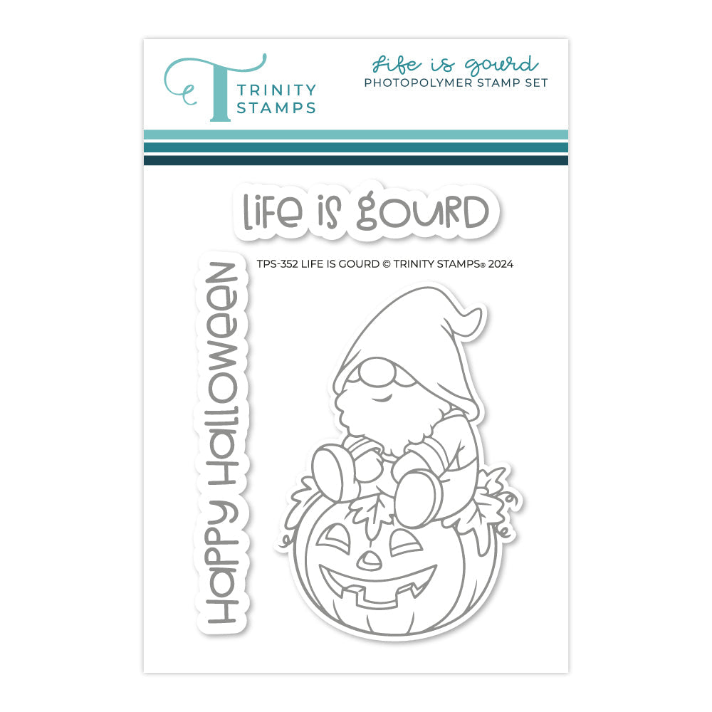 Introducing the Life is Gourd 3 x 4 inch stamp set—a delightful trio of stamps featuring a charming gnome perched on a festive pumpkin and two sentiments, 'life is gourd' and 'happy halloween'. Pair it with the coordinating die set (sold separately) for maximum cuteness!
