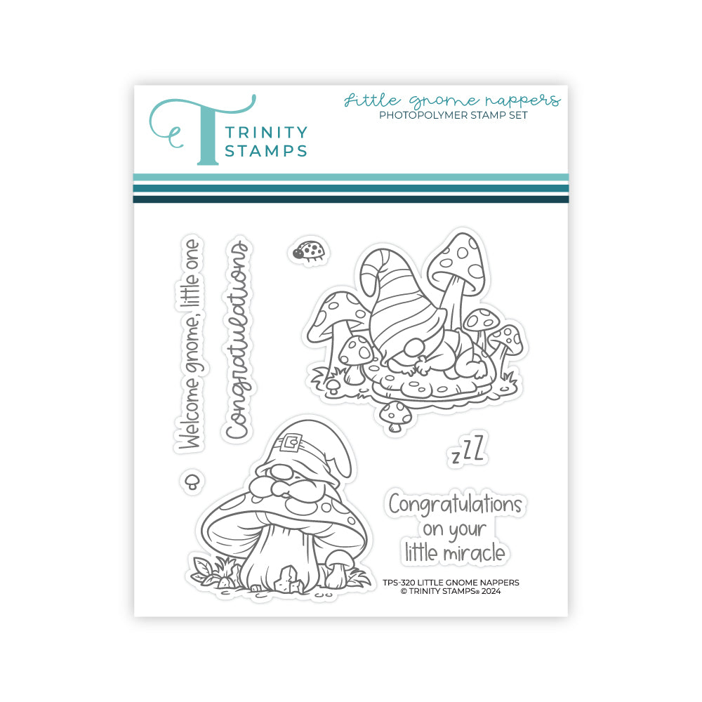 Introducing Trinity Stamps' Little Gnome Nappers Clear Stamp Set! Get ready to grin with these adorable gnome nappers! This 4 x 4 inch set includes 8 stamps, including 3 sentiments, to add serious charm to your projects. Sentiments include,