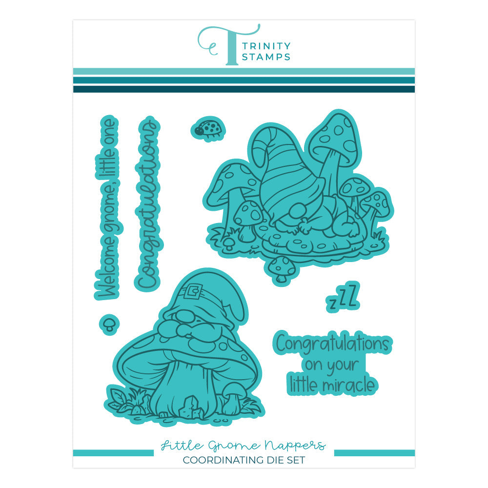 Introducing Trinity Stamps' Little Gnome Nappers Die Set! This coordinating set cuts out all the sentiments and images from the Little Gnome Nappers 4 x 4 inch Stamp Set. With 8 dies included, crafting just got easier!