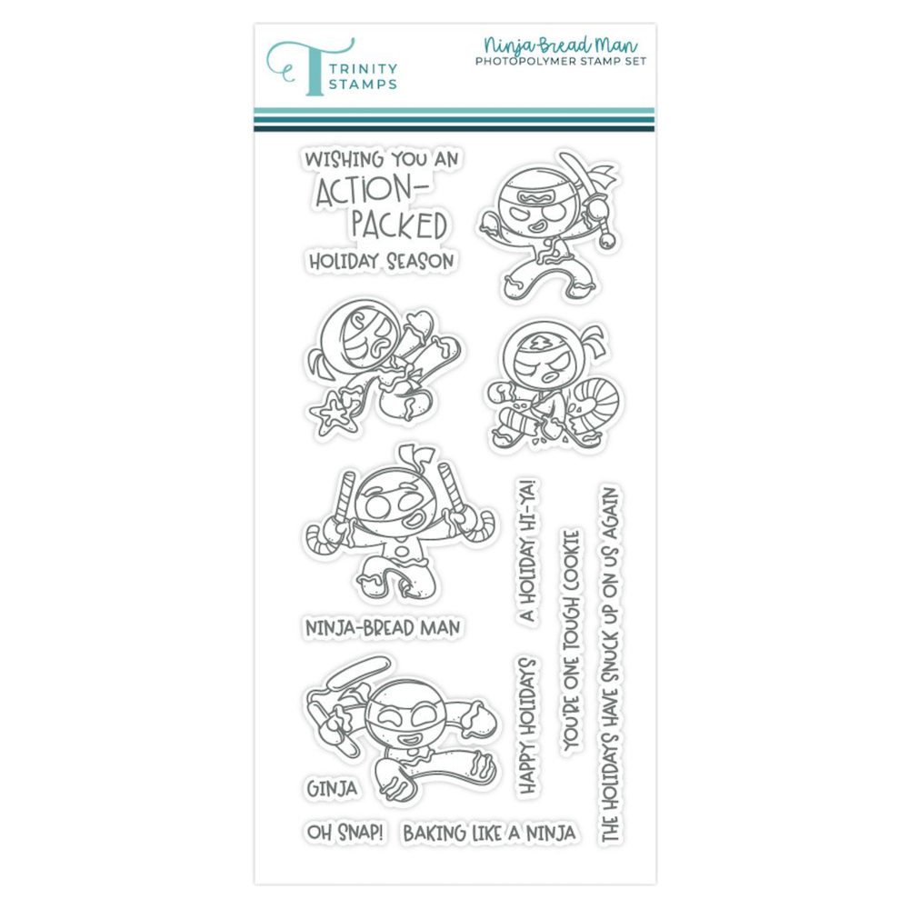 The Trinity Stamps Ninja Bread Man Clear Stamp Set features 5 cool Ninja cookie characters and 9 playful sentiments. Sentiments include,
