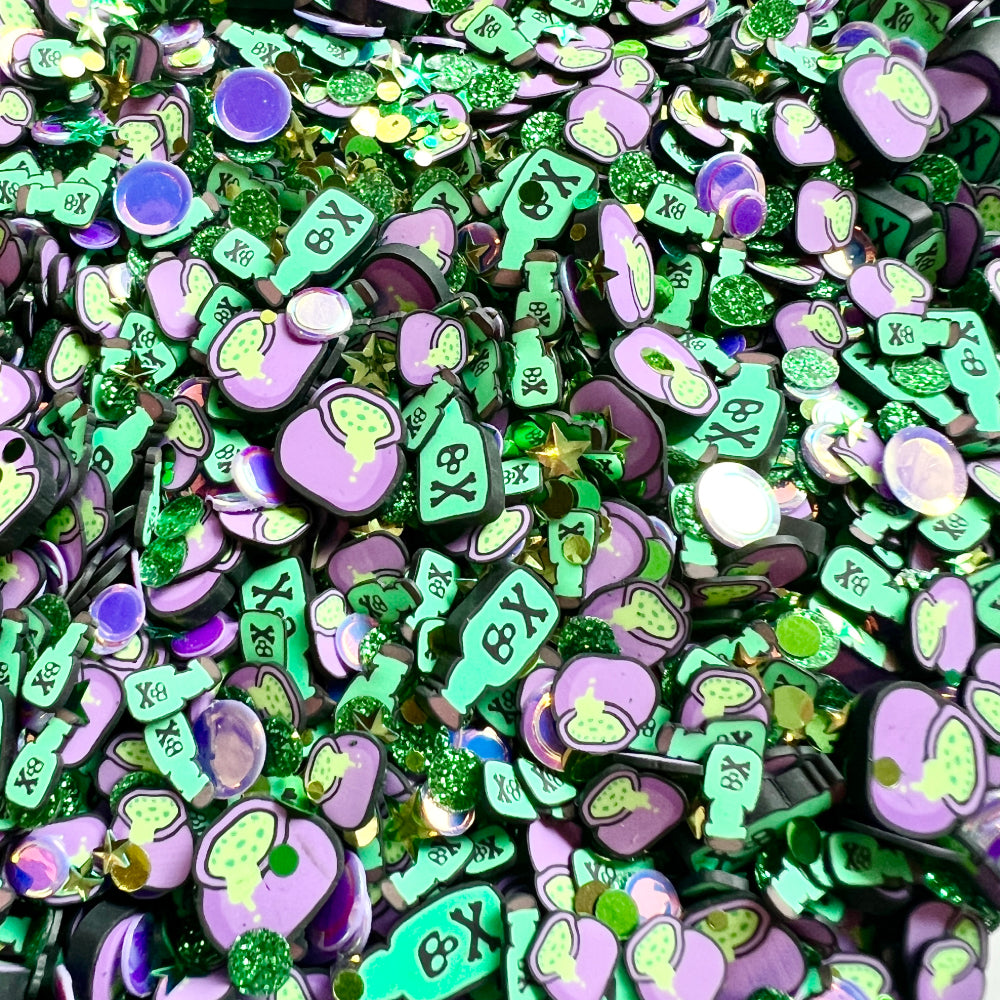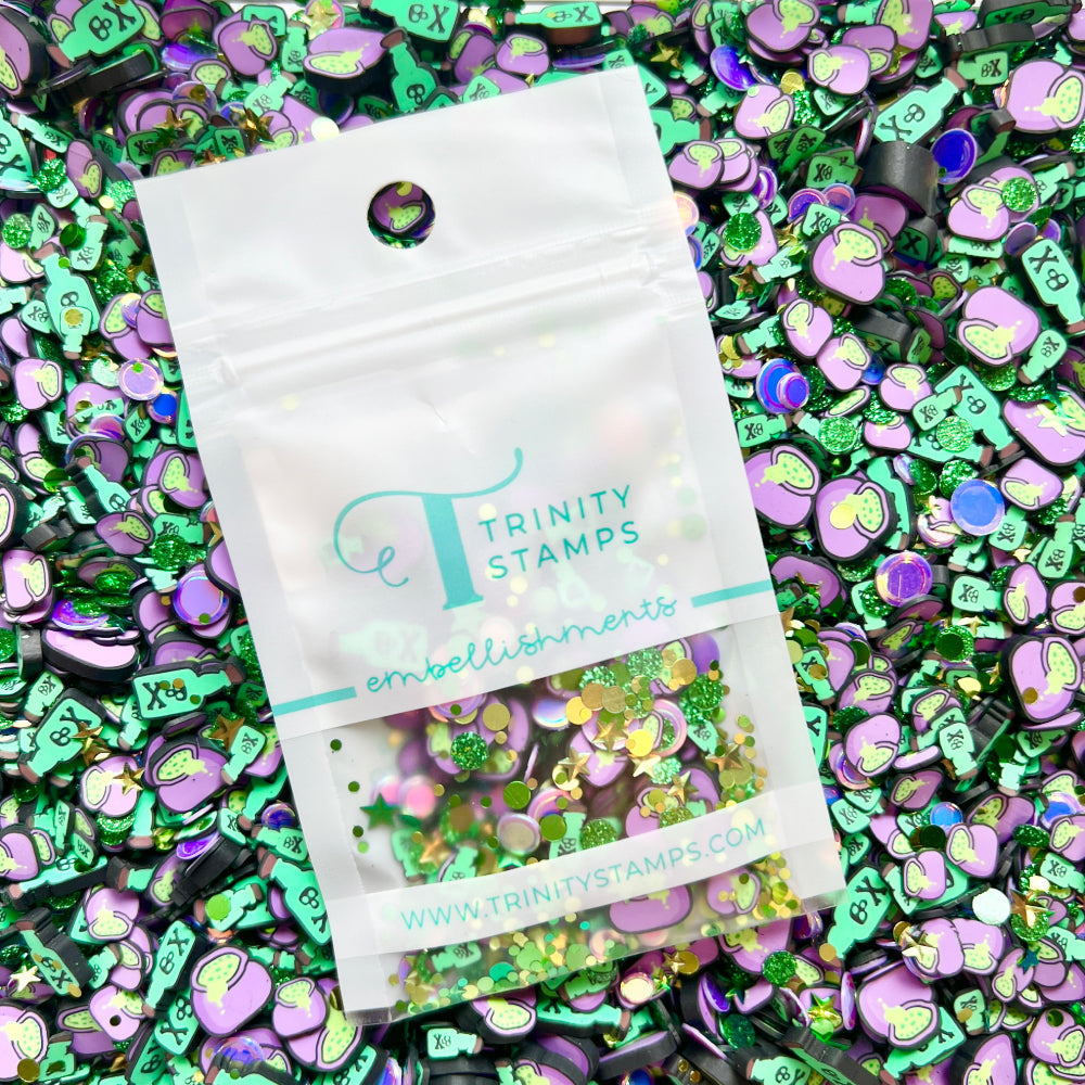 The Trinity Stamps Non-Toxic Embellishment Mix is a magical blend of clay cauldrons and potion bottles, mixed with shiny confetti to add a whimsical touch to your Halloween or fantasy-themed crafts. Perfect for shaker cards, scrapbooks, or any creative project that needs a dash of enchantment, this mix offers approximately 2 teaspoons of embellishments, all packaged in a convenient resealable zip-top bag.