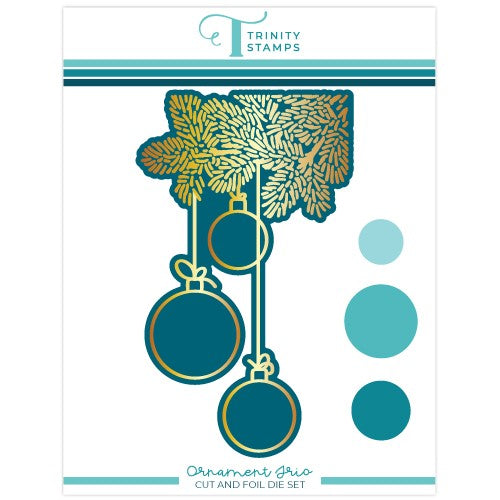 Ornament Trio features one foil plate of three ornaments hanging from a pine bough and a die to cut out the image. Also contains three circle dies to cut out the centers of the ornaments. Cut out foil ornament trio image measures 3.2 x 5.4 inches