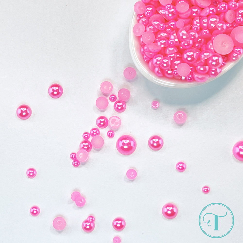 This mix of bright pink flat-back baubles comes in five sizes (3mm, 4mm, 5mm, 6mm, and 8mm), approximately 2 teaspoons worth. They're packed in a bag with a resealable zip top, perfect for keeping them fresh and organized!