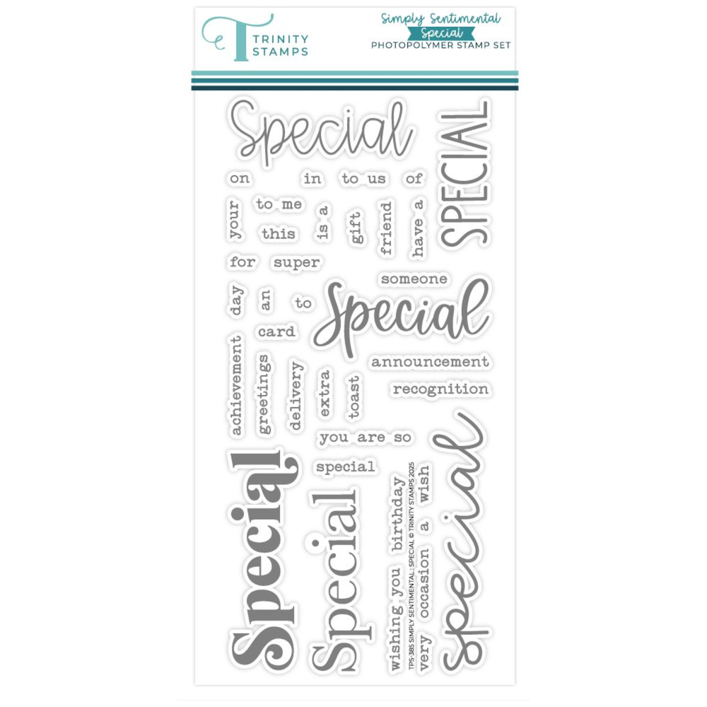 The Trinity Stamps Simply Sentimental Special Clear Stamp Set is a versatile sentiment builder that lets you create personalized greetings for all kinds of meaningful moments. Featuring multiple styles of the word 'special' and a variety of mix-and-match companion phrases, this 4 x 8 inch set is perfect for birthdays, achievements, friendships, and more.