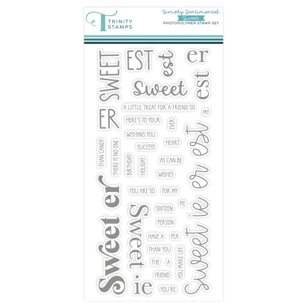 The Trinity Stamps Simply Sentimental Sweet Clear Stamp Set is a mix-and-match sentiment builder perfect for crafting heartfelt messages. With multiple fonts and styles of the word 'sweet,' along with coordinating phrases, this 4 x 8 inch set is great for birthdays, thank-yous, treats, and everyday kindness.